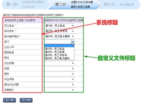 系統(tǒng)將自動(dòng)讀取上傳的文件標(biāo)題并在頁(yè)面右邊列表顯示上傳文件中的全部標(biāo)題名稱(chēng)(即自定義文件標(biāo)題),通過(guò)與左邊系統(tǒng)標(biāo)題的對(duì)應(yīng)后,點(diǎn)擊“下一步”按鈕即可進(jìn)行第三步的操作。