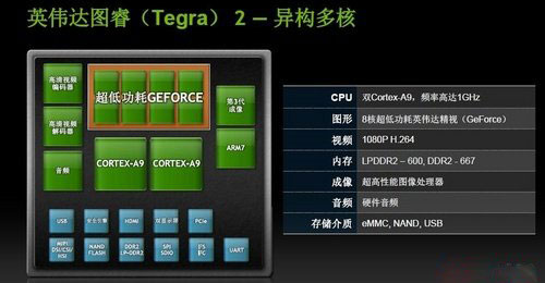 而英偉達(dá)圖睿Tegra 2就是專為移動(dòng)市場而設(shè)計(jì)的超級(jí)芯片,Tegra 2雙核處理器采用了40納米工藝制程,有兩顆Cortex-A9處理器,主頻高達(dá)1GHz。Tegra 2處理器芯片只有1/4個(gè)硬幣大小,雙核以更低的功耗實(shí)現(xiàn)同等性能,多任務(wù)處理速度提升一倍,尤其是處理Flash以及HTML5的速度最快。