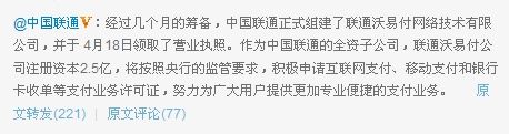 而中國聯(lián)通昨日宣布,中國聯(lián)通正式組建了聯(lián)通沃易付網(wǎng)絡(luò)技術(shù)有限公司,并于 4月18日領(lǐng)取了營業(yè)執(zhí)照。