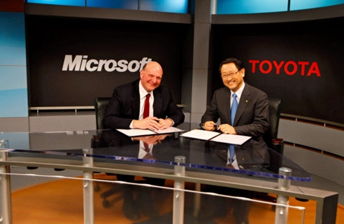 4月初簽署合作協(xié)議的豐田汽車總裁豐田章男(右)與微軟CEO鮑爾默