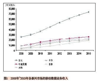 我們預測,2015年新興市場運營商的移動數(shù)據(jù)業(yè)務收入將達到1620億美元,在2010年這一數(shù)字只有834億美元,5年間的復合年均增長率將達到14%,總體增長率為94%。顯而易見的是,移動數(shù)據(jù)業(yè)務將快速發(fā)展,未來將成為運營商制勝新興市場的關鍵。