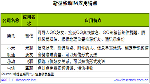 新型移動IM(米聊、微信等)建立在手機(jī)通訊錄的基礎(chǔ)上,較以往移動QQ、飛信等具有更強(qiáng)的用戶粘性,并且克服了傳統(tǒng)移動IM需要反復(fù)登錄、只能發(fā)送文字、圖片等缺點(diǎn)。