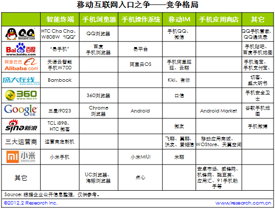 2012年,移動(dòng)互聯(lián)網(wǎng)“入口之爭(zhēng)”仍將繼續(xù),隨著移動(dòng)終端的普及,用戶數(shù)量和流量都將快速增長(zhǎng),各企業(yè)的核心策略仍以用戶數(shù)和流量為主,并在此基礎(chǔ)上開始探索商業(yè)模式,并開始布局整個(gè)生態(tài)系統(tǒng)?梢灶A(yù)見,下一步的競(jìng)爭(zhēng)將蔓延到更具體的應(yīng)用類型上,但是互聯(lián)網(wǎng)企業(yè)的參與度不會(huì)像入口型應(yīng)用這么高,投資和兼并事件將有所增加。