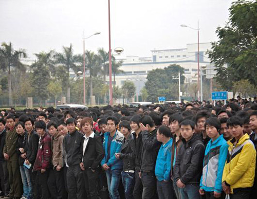 在一個(gè)周一上午,約3000名外來(lái)工人在深圳的富士康招聘中心門前,希望獲得在富士康的工作機(jī)會(huì)。