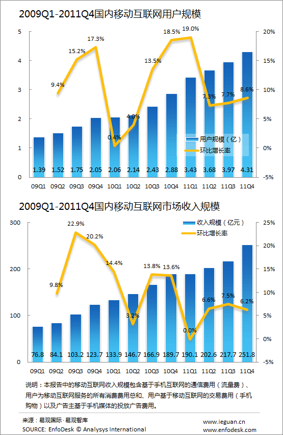 從用戶及收入規(guī)模來看,用戶規(guī)模的增速相對穩(wěn)定,2011年第4季度相比上季度在整體手機(jī)銷量下降的前提下,智能手機(jī)保持較快速的增長,增速達(dá)16.77%,外加臨近年底,微博等移動應(yīng)用的活躍度有所提高,整體用戶規(guī)模增速并未呈現(xiàn)下滑。