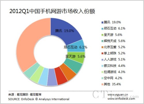 CTI論壇(ctiforum)5月23日消息(記者 歐陽): 根據EnfoDesk易觀智庫產業(yè)數據庫最新發(fā)布的《2012年第1季度中國手機游戲市場季度監(jiān)測》數據顯示2012年第1季度手機網絡游戲市場規(guī)模4.4億,具體手機網絡游戲開發(fā)商市場競爭格局如下圖所示: