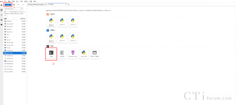 參加本次活動,用戶只需四步就可開啟AI作圖之旅。第一步,在商城選擇stable-diffusion-xl-1.0 商品后點擊“立即使用”,并在后續(xù)出現(xiàn)的notebook頁面點擊左上角“+”,以此進入終端頁面。