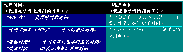 如果工作狀態(tài)最佳,代表的工作目標為80%的時間用在呼叫上,其余為非生產(chǎn)時間。主管運用ACD報告結(jié)合第一手調(diào)查資料考察這些工作所用的時間。