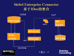 在這個名為Siebel Enterprise Connector的中間軟件中,這種整合通過兩個方法來實(shí)現(xiàn)。一是通過中間文件(Intermediate Document IDoc)實(shí)現(xiàn)的整合(圖示一),它可以把SAP中的基本信息輸入到Siebel中,其中IDocs接收器接收從SAP服務(wù)器中存儲的關(guān)于客戶戶口、聯(lián)系人、產(chǎn)品和價格等信息,然后把這些信息存入IDocs界面中,這個界面是Siebel的整合管理(Enterprise Integration Manager,EIM)的一部分,于是這些信息就可以完全傳入到Siebel中。這樣的整合不僅在CRM最初啟動的時候可以用來進(jìn)行數(shù)據(jù)轉(zhuǎn)化,而且在ERP和CRM的同步運(yùn)行中還能不斷地把最新調(diào)整的產(chǎn)品目錄、價格和折扣等信息輸入到前端軟件中,讓銷售人員可以及時地給出正確的報價。