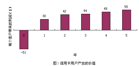 以信用卡服務(wù)為例,爭(zhēng)取一個(gè)新的用戶平均要51美圓,用于廣告、推銷和開(kāi)戶等開(kāi)支。用戶開(kāi)始時(shí)花錢(qián)很少,但為公司帶來(lái)一定的利潤(rùn)。但如果用戶繼續(xù)使用到第二年,就會(huì)為公司帶來(lái)更多的經(jīng)濟(jì)效益,因?yàn)楣九c客戶之間的信任和客戶對(duì)公司的滿意,致使客戶更多地通過(guò)信用卡消費(fèi)。(圖:"信用卡用戶產(chǎn)生的價(jià)值")用戶貢獻(xiàn)在增加,公司的運(yùn)作費(fèi)用卻在不斷減低。信用卡公司可以不斷減少對(duì)客戶信用的審核時(shí)間。保持長(zhǎng)期的客戶關(guān)系,還可以減少?gòu)V告支出,客戶本身就是一個(gè)免費(fèi)的廣告資源。很多人在消費(fèi)前喜歡聽(tīng)取朋友的意見(jiàn),覺(jué)得比廣告更可信。