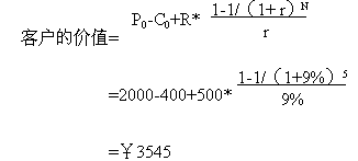 下面舉另一個(gè)例子具體說(shuō)明客戶價(jià)值的計(jì)算: 假設(shè)客戶與公司保持交易時(shí)間:N=5年;公司最初吸引每個(gè)客戶的成本(營(yíng)銷費(fèi)用): C0=¥400;客戶第一次購(gòu)買(mǎi)的產(chǎn)品價(jià)格:P0=¥2000;公司期望每年從每個(gè)客戶處增加的收入:R=¥500;利率(一般指貸款利率): r =9%;那么客戶的價(jià)值等于:客戶初次購(gòu)買(mǎi)產(chǎn)品和以后幾年每年消費(fèi)價(jià)值的折現(xiàn)之和,減營(yíng)銷成本,即: