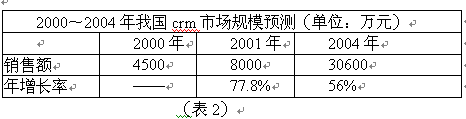 國內(nèi)CRM市場經(jīng)過一段時間的快速增長,2000年銷售額達到4500萬元左右。2001年市場情況將更好,預計銷售額將是上年的兩倍左右。CCID根據(jù)大量調(diào)查分析,對我國CRM市場規(guī)模作出如下預測: