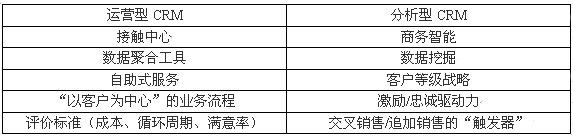 一般情況下CRM的可分為兩大類:即運(yùn)營型CRM和分析型CRM。(有時(shí)把"協(xié)作型CRM"單獨(dú)作為一類)。多數(shù)情況之下運(yùn)營型CRM引用的是產(chǎn)品,服務(wù)和一個企業(yè)實(shí)際能夠"照料"客戶的運(yùn)做能力。關(guān)系中心,數(shù)據(jù)集合系統(tǒng)及Web站點(diǎn)僅僅是一些例子。分析型CRM主要指用來推動"以客戶為中心"的戰(zhàn)略和工具。商務(wù)智能系統(tǒng),數(shù)據(jù)挖掘工具及客戶層級戰(zhàn)略都可以算在這個范疇之內(nèi)。