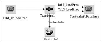 由于不同的源數(shù)據(jù)中可能包含同一個客戶的信息,因此采用Hashed File Stage HF_khjbxx存放輸出結果,相同客戶的信息根據(jù)客戶編碼覆蓋前面產(chǎn)生的信息,避免了重復的客戶信息。從不同源數(shù)據(jù)庫取得客戶信息,根據(jù)數(shù)據(jù)的真實性依次進行處理后,生成的客戶信息全部保存在一個Hash文件中,最后從Hash文件中取出結果數(shù)據(jù)裝載到目標數(shù)據(jù)庫中。