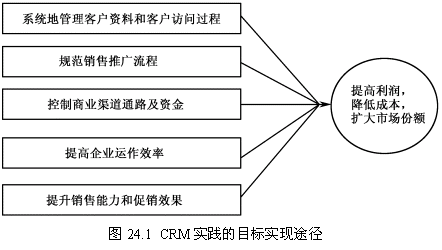 維奧制藥針對自身特定的業(yè)務(wù)需求,結(jié)合CRM的經(jīng)營理念,提出圖24.1所示CRM實(shí)踐的目標(biāo)實(shí)現(xiàn)途經(jīng)。