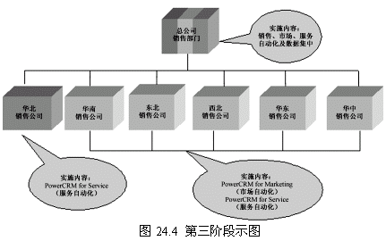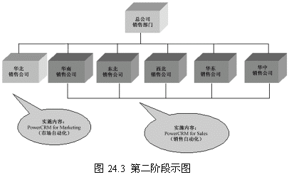 這一階段首先確立一個點(diǎn)(華北銷售公司),這個點(diǎn)的選擇要考慮多方面的因素,比如員工素質(zhì)、電腦應(yīng)用水平以及基礎(chǔ)設(shè)施等。第一階段目標(biāo)的實(shí)現(xiàn)對整個項(xiàng)目關(guān)系重大,是一個示范性的實(shí)施,對維持管理層和員工對CRM項(xiàng)目的信心具有重要的意義。