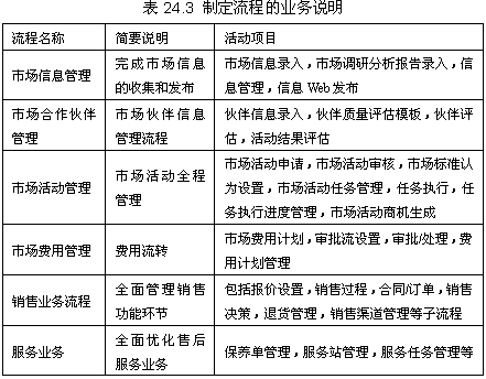 根據CRM軟件的總體目標,項目組詳細審核每個業(yè)務的流程,并按照流程對軟件進行定制。所制定的流程包括三大業(yè)務領域的業(yè)務,見表24.3。