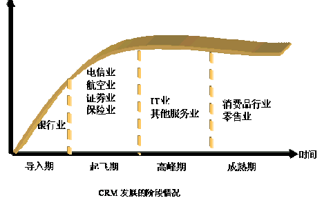 從圖中我們可以大致看出CRM的發(fā)展情況。保險,電信行業(yè)對這比較重視,而且得到了一定的應(yīng)用。但是在其他行業(yè)中的發(fā)展仍然比較緩慢。面對中國的龐大市場,從CRM的發(fā)展中不難看出:會隨著經(jīng)濟(jì)的發(fā)展得到長足的發(fā)展。隨著經(jīng)歷早期客戶是蒙昧期,后來是觀察期,現(xiàn)在是選擇期,CRM市場可能出現(xiàn)爆炸性的增長。CRM本身是很好的,發(fā)展到一定階段,引導(dǎo)期已經(jīng)過了,又會發(fā)展起來。