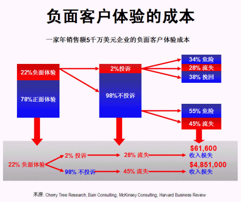 一家年銷售額五千萬美元的企業(yè),假設(shè)正面客戶體驗(yàn)為78%,負(fù)面體驗(yàn)為22%,在所有負(fù)面體驗(yàn)中,只有2%的客戶投訴,其余98%大多數(shù)均不投訴,保持沉默(這與現(xiàn)實(shí)情況頗為吻合)。在2%投訴客戶中,有34%經(jīng)過處理仍然未能令客戶完全滿意,尚有流失的危險(xiǎn);28%的客戶在處理后依然流失,余下38%的客戶則感到滿意,繼續(xù)留下。對(duì)大部分(98%)沒有投訴的客戶,因公司對(duì)他們的不滿意并不知情,所以沒有采取行動(dòng),55%的客戶有隨時(shí)流失的危險(xiǎn),其余45%已經(jīng)流失。