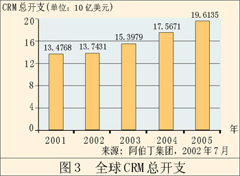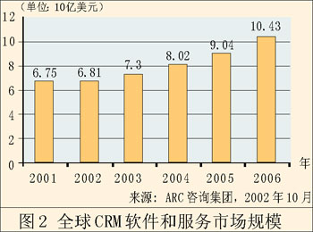 單單這還不是惟一能夠說明問題的。早在2002年,F(xiàn)orrester研究公司就聲稱,來自CRM的收入將從428億美元增長到738億美元。AMR研究公司同樣預(yù)測,這個(gè)領(lǐng)域會(huì)不斷增長。AMR的調(diào)查表明,91%的公司會(huì)在這方面增加開支,預(yù)計(jì)總開支會(huì)增長8%。值得一提的是,AMR所指的這一塊市場是“客戶管理”,而不是較為傳統(tǒng)的CRM,這說明CRM應(yīng)用軟件的作用發(fā)生了轉(zhuǎn)變。