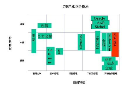 伴隨著中國CRM市場的逐步繁榮,CRM產(chǎn)業(yè)競爭格局已然悄然改變。國內(nèi)廠商的更替變化,國外廠商的步步進逼,一幕幕不斷上演。變化的背后,沒有顯見的是激烈競爭角逐;改變帶來的亦是對市場發(fā)展的積極推動。記得,在2005年以前,在市場中活躍的廠商基本都是中國本土的,而且總是那幾個老面孔。適者生存,中國CRM市場經(jīng)歷了6個年頭的洗禮后,現(xiàn)在的產(chǎn)業(yè)競爭格局,已經(jīng)逐步明朗起來。我個人從2個緯度來定位,即:價格特征、產(chǎn)品應(yīng)用特征。從價格特征來看,有高端、中端和低端。從產(chǎn)品應(yīng)用特征來看,有項目定制、客戶管理、銷售管理、工作流管理和營銷業(yè)務(wù)管理。如下圖所示。營銷業(yè)務(wù)管理則涵蓋了客戶管理、市場管理、銷售管理和服務(wù)管理的應(yīng)用。目前,中國本土CRM廠商,大多數(shù)都在致力于把營銷業(yè)務(wù)管理做好。不過,從具體的產(chǎn)品功能和應(yīng)用深度,以及產(chǎn)品客戶化能力方面,各廠商的優(yōu)劣勢還是非常明顯的。這也是,企業(yè)在選型CRM產(chǎn)品的時候,非常重視的一些關(guān)鍵評估指標。但是,廠商要實現(xiàn)全面的功能、深度的應(yīng)用以及強大的客戶化能力,是需要付出很高的研發(fā)投入的,而且也需要較長的一段產(chǎn)品化的周期。這似乎是一個很難逾越的門檻,尤其是對于中國本土的CRM廠商來說,更是如此。因為,資金和人才資源畢竟是相當(dāng)有限的。所以,眾多CRM廠商中,真正能夠獲得客戶青睞,幫助客戶實現(xiàn)企業(yè)級CRM應(yīng)用的一線廠商,也許只是少有的幾家了。目前,MyCRM、saleslogix、TurboCRM以及MSCRM等,都是客戶不錯的選擇。