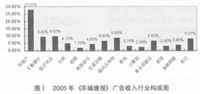 廣告客戶在報紙投放廣告的目的在于說服讀者成為其產(chǎn)品或服務(wù)的消費者,他們最感興趣的是向那些最有可能成為其消費者的讀者做廣告,而“報紙讀者與廣告目標(biāo)受眾的相關(guān)性決定了廣告信息是否能夠到達(dá)廣告客戶所希望的人群”。為此,廣告客戶更愿意在其目標(biāo)消費群接觸率高的報紙上投放廣告。由于《羊城晚報》的讀者群具有學(xué)歷較高、職業(yè)較穩(wěn)定、收入較高、消費能力較強(qiáng)等特點,因此成為房地產(chǎn)、汽車、電訊、家具等耐用消費品行業(yè)塑造品牌的平臺。另外,《羊城晚報》的讀者以家庭訂戶為主,他們對健康、教育、休閑、娛樂比較關(guān)注,因此醫(yī)藥、文化教育、食品保健品、旅游等廣告在羊城晚報也占有較大比例(見圖Ⅰ,統(tǒng)計期間為2005年1月-10月)。