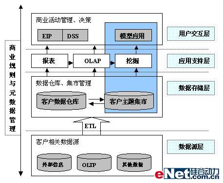從上面的分析型CRM體系結(jié)構(gòu)圖可以看出,整個(gè)架構(gòu)分為數(shù)據(jù)源層、數(shù)據(jù)存儲(chǔ)層、應(yīng)用支持層和用戶交互層總共四層。數(shù)據(jù)源層包括了企業(yè)常用信息系統(tǒng)和一些外部系統(tǒng)的數(shù)據(jù)源,比如涉及到客戶交互的一些交易系統(tǒng),服務(wù)系統(tǒng),各系統(tǒng)間的客戶數(shù)據(jù)是分散的,而且可能重合,出現(xiàn)不一致的問(wèn)題;數(shù)據(jù)存儲(chǔ)層是為了整個(gè)企業(yè)有集中統(tǒng)一的客戶視圖,通過(guò)從各源系統(tǒng)抽取數(shù)據(jù),進(jìn)行整合后的數(shù)據(jù)倉(cāng)庫(kù),而且在客戶數(shù)據(jù)倉(cāng)庫(kù)的基礎(chǔ)上,可以建立相關(guān)分析之用的客戶主題數(shù)據(jù)集市;應(yīng)用支持層除了支持復(fù)雜,智能化報(bào)表查詢外,還支持OLAP分析,提供數(shù)據(jù)挖掘功能;用戶交互層提供分析和挖掘結(jié)果同企業(yè)管理、決策層和企業(yè)其它服務(wù)人員和客戶的交互,形成反饋機(jī)制,從而有效地利用分析和挖掘得到的有用知識(shí)。