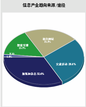 在“您的公司在哪里得知新的信息產(chǎn)業(yè)趨向”這個(gè)問題上,在本次調(diào)查得到的所有回復(fù)中,有32.6%的被調(diào)查者把報(bào)紙雜志作為他們的首要信息來源,而這些報(bào)紙雜志主要是CRM/CIO雜志, 以及其他各種軟硬件雜志等。有28.4%的調(diào)查者認(rèn)為他們的最新信息主要來源于一些交流活動(dòng),約見一些銷售代表,研討會(huì)和口述的消息(word of mouth)等,特別是研討會(huì),有12.14%的被調(diào)查者認(rèn)為自己的最新信息主要來源于各種規(guī)模的研討會(huì)。來源之三則是Internet, 有21.9%把相關(guān)網(wǎng)站作為他們的獲取信息的主要來源,這些網(wǎng)站主要包括國(guó)內(nèi)的知名門戶網(wǎng)站新浪(www.sina.com)、搜狐(www.sohu.com)、網(wǎng)易(www.163.com)等。除此,還有15.7%的被調(diào)查者把搜索引擎作為他們的主要信息來源,選擇使用Google的為8.33%, 選擇使用百度的為7.32%。