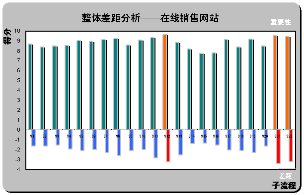 。2)整體差距分析(Gap Analysis)。請見上圖X軸下方所示,計(jì)算所有被調(diào)查對所列在線銷售網(wǎng)站的滿意度平均值(綜合最喜歡在線銷售網(wǎng)站和最不喜歡在線銷售網(wǎng)站的滿意度,計(jì)算被調(diào)查者對22個子流程的滿意度評分)。通過計(jì)算重要性和滿意度的差距,首先,一個有趣的現(xiàn)象,在著色的三個差距最大的子流程剛好也是重要性得分排名前三位的流程S12,