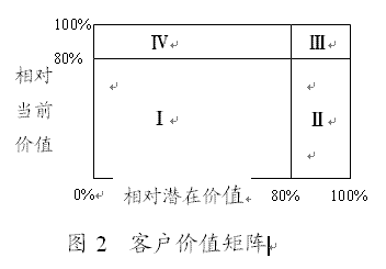 在上一步中,我們預測出客戶當前相對價值和客戶相對潛在價值;于是可據(jù)此建立客戶價值矩陣。根據(jù)Pareto原理,客戶當前相對價值中有20%的屬于優(yōu)質客戶,80%屬于一般客戶,同樣客戶潛在價值中也如此。因此,下面的客戶價值矩陣的橫、縱軸各自都以80%分段,