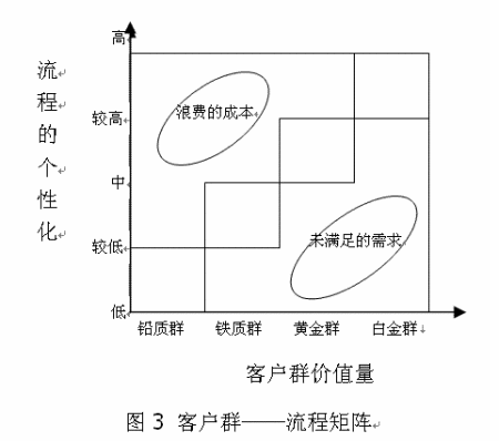 圖中橫軸代表客戶群價值量,從“鉛質客戶群”到“白金客戶群”過渡。縱軸表示業(yè)務流程的個性化程度(包括流程的靈活性、流程的活動承擔者的設置、流程中的活動要素的配置等),是一種與客戶群價值量相對應的供應方面的流程特征。左上方的橢圓圈表示對價值量低的鉛質群、鐵質群客戶設置了個性化較高的流程,這表明企業(yè)資源配置不合理,因而有些資源的投入大于產(chǎn)出,從而產(chǎn)生過高的成本。右下方的橢圓圈則代表了未被滿足的需求。用很標準化的、缺乏人情味的流程向高價值的黃金群客戶、白金群客戶提供產(chǎn)品和服務,將難以讓這些客戶滿意,從而導致高價值客戶的流失。圖的中間部分,四個矩形框的對角線位置則代表了客戶群價值和流程個性化恰當?shù)钠ヅ。因此,企業(yè)可在四個矩形框的各自兩條對角線相交部分設置“白金客戶群流程、黃金客戶群流程、鐵質客戶群流程、鉛質客戶群流程”這四類流程,以此找到客戶群——由資源創(chuàng)造的產(chǎn)品和服務——流程群的最佳匹配。從圖中也可看出,鉛質客戶群流程的標準化程度最高,通常不用提供特殊的個性化的服務及產(chǎn)品。白金群客戶流程的定制化則最高,企業(yè)需要為其量身打造流程。顯然這兩個流程的資源分配存在極大的差異。