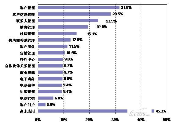調(diào)查顯示,2007年有45.3%的企業(yè)還未應用CRM信息化系統(tǒng)。在已經(jīng)應用該系統(tǒng)的企業(yè)中,CRM系統(tǒng)應用主要就是客戶管理,占到31.9%;其次是客戶信息管理和聯(lián)系人管理,這些應用比例集中在23~31%之間;其他應用還有銷售管理(19.5%)、時間管理(15.1%)、供應商關(guān)系管理(12.8%)、客戶服務(11.5%)和營銷管理(10.5%)等,呼叫中心、合作伙伴關(guān)系管理、商業(yè)智能、電子商務、電話銷售、知識管理、電話營銷等比例均在10%以下。