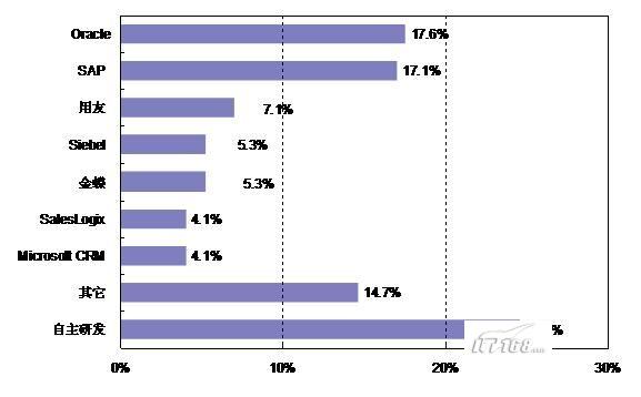 在開展了CRM系統(tǒng)應用的企業(yè)中,CRM系統(tǒng)品牌認知度最高的是ORACLE和SAP,分別占17.6%和17.1%;其他品牌還有用友(7.1%)、Siebel(5.3%)、金碟(5.3%)、Sales Logix(4.1%)和Microsoft CRM(4.1%)等;另有24.7%的企業(yè)是自主開發(fā)的CRM系統(tǒng)。