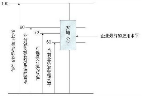 如果用一個(gè)數(shù)量化的概念來表達(dá)的話,假定行業(yè)內(nèi)最好的軟件是100分,企業(yè)做到極致對系統(tǒng)的需求可能是80分,當(dāng)然也可能沒有一個(gè)軟件能滿足企業(yè)所有的需求,但從整體上,一個(gè)企業(yè)的主體需求一定在行業(yè)內(nèi)最好的軟件標(biāo)桿之下。而當(dāng)前的業(yè)務(wù)和管理水平一般到不了極致,假設(shè)是60分,那選擇的軟件70-75分一定是合適的,高于當(dāng)前需求,而不要高得太多,最終的實(shí)施水平是一個(gè)區(qū)間,這取決于實(shí)施商的能力和企業(yè)的能力,可能會(huì)低于企業(yè)當(dāng)前業(yè)務(wù)和管理水平,也可能使系統(tǒng)超水平發(fā)揮,而企業(yè)最終的應(yīng)用水平一般就在這個(gè)區(qū)間里游動(dòng)了。這個(gè)模型看起來很理論化,操作時(shí)需要考慮很多的因素,但是非常有價(jià)值的判斷標(biāo)準(zhǔn)。