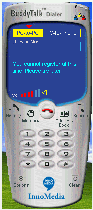 。ㄈ鐖D3),這個(gè)就是BuddyTalk的軟件界面。這象不象一個(gè)手機(jī)?上面的藍(lán)色部分是液晶屏。你可以選擇pc-to-pc或者pc-to-phone,下面是用來(lái)輸入電話號(hào)碼的一個(gè)空框,空框下面的部分是軟件顯示提示信息的,再下面是音量大小的顯示器。液晶屏的下面部分跟手機(jī)幾乎一樣,其中一個(gè)“search”,這是用來(lái)上網(wǎng)實(shí)現(xiàn)全球用戶數(shù)據(jù)庫(kù)搜索,一個(gè)“options”,各種設(shè)置可以在這里完成,“Memory”記錄的是你通話信息,以利快速撥號(hào)。