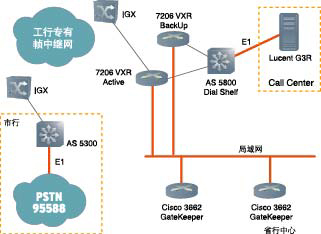 AS 5800 Dial Shelf上的E1接口直接連接客戶服務(wù)中心的Lucent公司G3R交換機(jī)。市行的語音網(wǎng)關(guān)Cisco AS 5300同樣通過高速串口接入幀中繼網(wǎng)絡(luò),與本地網(wǎng)絡(luò)完全隔離。市行申請(qǐng)的95588數(shù)字中繼線路(多采用ISDN