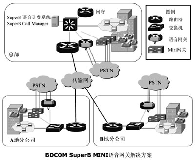 根據(jù)西北石油公司各地分公司電話(huà)全部是PSTN直線(xiàn)電話(huà),沒(méi)有單位內(nèi)部的PBX,不能通過(guò)語(yǔ)音網(wǎng)關(guān)把這些直線(xiàn)電話(huà)統(tǒng)一接入到IP網(wǎng)絡(luò)上這一實(shí)際情況,方案提供方博達(dá)公司提供了一款小型BDCOM SuperB Mini語(yǔ)音網(wǎng)關(guān),來(lái)解決PSTN程控電話(huà)統(tǒng)一接入IP語(yǔ)音網(wǎng)絡(luò)的問(wèn)題。使用BDCOM SuperB Mini并結(jié)合西北石油公司組建的企業(yè)內(nèi)部VoIP網(wǎng)絡(luò),克服了傳統(tǒng)語(yǔ)音網(wǎng)關(guān)解決方案的不足和缺點(diǎn)。