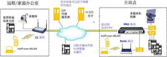 SonicWALL利用其分布式無(wú)線解決方案將完全的VoIP安全性擴(kuò)展到附屬的無(wú)線網(wǎng)絡(luò)。無(wú)論是利用內(nèi)置802.11無(wú)線功能的TZ 170系列,還是配合使用PRO系列設(shè)備和SonicPoint