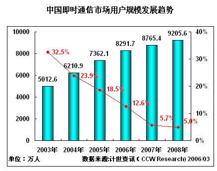 即時通訊巨大的市場價值主要來自三方面,除了能夠增加門戶網(wǎng)站的用戶的黏性,即時通訊能夠帶來巨大的用戶和網(wǎng)絡(luò)通訊巨大的市場。根據(jù)計世資訊《2005-2006年中國VoIP業(yè)務(wù)發(fā)展趨勢研究報告》相關(guān)數(shù)據(jù)顯示,2005年中國即時通訊用戶達到7362.1萬人,增長率為18.5%,2005年中國即時通訊市場規(guī)模達到16.2億元,實現(xiàn)37.3%的增長率。