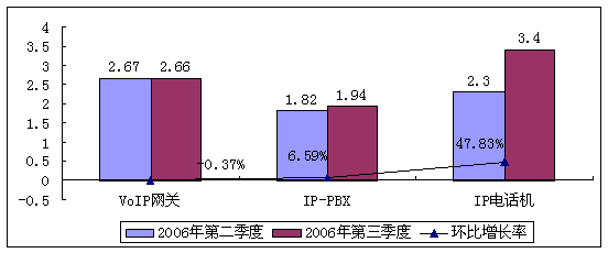 目前由于政策方面的原因,在中國涉及到PSTN的VoIP仍然是灰色地帶,屬于地下行為,因此中國VoIP設(shè)備市場仍然只是進(jìn)入初步發(fā)展階段,整體市場保持穩(wěn)定增張態(tài)勢,賽迪顧問預(yù)計2006年第三季度我國VoIP設(shè)備市場總體上仍將保持穩(wěn)定增長,不會出現(xiàn)大起大落的局面,2006年第三季度中國VoP設(shè)備市場總量將達(dá)到約8億元人民幣。