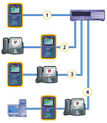 下面所顯示的四個(gè)測(cè)試位置支持包括VoIP網(wǎng)絡(luò)測(cè)試、監(jiān)測(cè)和故障診斷能力的完整的VoIP周期:在電話安裝前、電話安裝后以及將 NetTool 與電話串聯(lián)在一起。