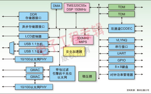 德州儀器(TI)公司最新的VoIP處理器設(shè)計(jì)用于確保在中小企業(yè)應(yīng)用中提供無(wú)延遲的語(yǔ)音服務(wù)。這種名為TNETV1051的處理器集成了1個(gè)300MHz的MIPS處理器、1個(gè)150MHz的C55x數(shù)字信號(hào)處理器(DSP)、2個(gè)千兆位以太網(wǎng)(GbE)媒體訪問(wèn)控制器(MAC),以及1個(gè)片內(nèi)GbE交換器。