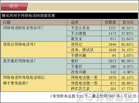 VoIP即網(wǎng)絡(luò)電話,與傳統(tǒng)電話相比,其最大的不同在于語(yǔ)音是通過(guò)寬帶互聯(lián)網(wǎng)而非傳統(tǒng)的電話網(wǎng)絡(luò)傳輸。由于所需的交換設(shè)備數(shù)量比傳統(tǒng)電話少,其運(yùn)營(yíng)成本大幅降低,從而形成了天然的資費(fèi)優(yōu)勢(shì)。從騰訊對(duì)VoIP的調(diào)查來(lái)看,雖然有很多人認(rèn)為VoIP “不怎么安全”,但是提到“使用過(guò)VoIP嗎?”、“是否看好VoIP”、“VoIP與傳統(tǒng)電話相比哪個(gè)更有優(yōu)勢(shì)?”時(shí),被調(diào)查人的答案是肯定的。雖然大家都覺(jué)得VOIP技術(shù)還存在不完善的地方,但是它帶給人們的優(yōu)惠是十分實(shí)在,因此大家對(duì)它的發(fā)展前景非?春。而其中最大的支持者莫過(guò)于中國(guó)90%以上的中小企業(yè)。