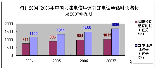 圖1:2004-2006年中國(guó)大陸電信運(yùn)營(yíng)商IP電話(huà)通話(huà)時(shí)長(zhǎng)增長(zhǎng)及2007-2008年預(yù)測(cè)。