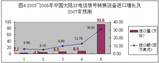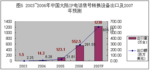 圖5:2003-2006年中國(guó)大陸IP電話(huà)信號(hào)轉(zhuǎn)換設(shè)備出口及2007年預(yù)測(cè)。