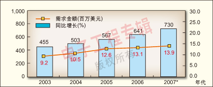 5.IP電話(huà)信號(hào)轉(zhuǎn)換設(shè)備市場(chǎng)需求將不斷增長(zhǎng)。2006年,中國(guó)大陸IP電話(huà)信號(hào)轉(zhuǎn)換設(shè)備的總需求規(guī)模為6.41億美元,同比增長(zhǎng)13.1%;預(yù)計(jì)今年的總規(guī)模將達(dá)7.3億美元,同比增長(zhǎng)13.9%(見(jiàn)圖6)。
