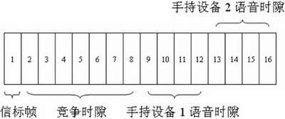 根據(jù)設(shè)計的特點,無線語音網(wǎng)關(guān)同手持設(shè)備間的無線網(wǎng)絡(luò)采用星型拓?fù)浣Y(jié)構(gòu),無線語音網(wǎng)關(guān)作為無線個域網(wǎng)的協(xié)調(diào)器同手持設(shè)備進(jìn)行信息交互。IEEE802.15.4MAC層分為使用信標(biāo)幀和不使用信標(biāo)幀兩種工作模式,本設(shè)計采用使用信標(biāo)幀同步的超幀結(jié)構(gòu),由無線語音網(wǎng)關(guān)發(fā)送信標(biāo)幀同步無線手持設(shè)備的數(shù)據(jù)傳輸。本設(shè)計中超幀長30ms,等分為16個時隙,每個時隙為1.875ms。信標(biāo)幀在時隙1發(fā)送,時隙2到時隙8為競爭時隙,使用時隙CSMA-CA算法傳輸命令幀和應(yīng)答幀。時隙9到時隙16固定分配給兩個手持設(shè)備作為上下行語音數(shù)據(jù)通道。上下行各兩個時隙的分配可以滿足經(jīng) g.726壓縮后16Kb/s的語音數(shù)據(jù)傳輸帶寬要求。超幀結(jié)構(gòu)如圖3所示。