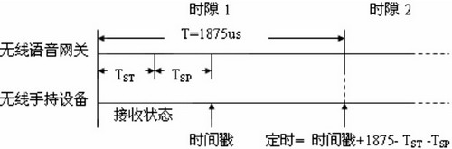 由于所有信息傳輸都是在雙方約定的時隙內(nèi)進(jìn)行,時隙的錯位,抖動都將造成丟幀,而丟幀對語音質(zhì)量的影響非常大,所以本設(shè)計的一個關(guān)鍵點是實現(xiàn)語音網(wǎng)關(guān)與手持設(shè)備間的精確同步,即手持設(shè)備在收到信標(biāo)幀后保證隨后15個時隙與語音網(wǎng)關(guān)的對應(yīng)時隙對齊。本設(shè)計利用了射頻芯片MC13192的接收時間戳功能來實現(xiàn)精確同步,如圖4所示。