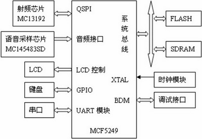 無線收發(fā)模塊采用Freescale公司符合IEEE802.15.4規(guī)范的射頻芯片MC13192,該芯片工作在2.4GHz頻段,提供16個無線通道,數(shù)據(jù)速率為250Kb/s[4],通過QSPI與主控芯片進(jìn)行數(shù)據(jù)交換。語音采樣模塊采用Motorola公司13位線形PCM編解碼芯片MC145483SD[5],該芯片對語音進(jìn)行AD采樣并形成線形PCM流,通過音頻接口與主控芯片交換數(shù)據(jù)。時鐘模塊的設(shè)計充分考慮手持設(shè)備的低功耗要求,提供高低兩種時鐘輸入。當(dāng)系統(tǒng)處于未通話狀態(tài),可向系統(tǒng)提供低頻率時鐘。時鐘輸入可通過軟件配置GPIO進(jìn)行選擇。因為要處理大量音頻數(shù)據(jù)和固化代碼,擴(kuò)展了片外SDRAM和FLASH。其他模塊還包括鍵盤,LCD,串口和BDM調(diào)試接口,其硬件框架如圖5所示。