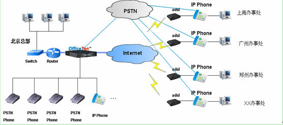 在企業(yè)總部部署一臺(tái)OfficeTen,利用OfficeTen的軟交換功能實(shí)現(xiàn)企業(yè)內(nèi)部IP網(wǎng)絡(luò)放號(hào)、IP Phone的注冊(cè)管理和寬帶網(wǎng)絡(luò)的接入,并可實(shí)現(xiàn)總部分機(jī)同時(shí)具有外線號(hào)碼功能。OfficeTen通過多路FXO口接入PSTN網(wǎng)絡(luò),通過Ethernet口接入Internet,實(shí)現(xiàn)語音和數(shù)據(jù)的綜合接入;對(duì)內(nèi)通過Ethernet口連接內(nèi)部Router和Switch,通過FXS口接入模擬PSTN Phone或通過Ethernet口接入IP Phone。